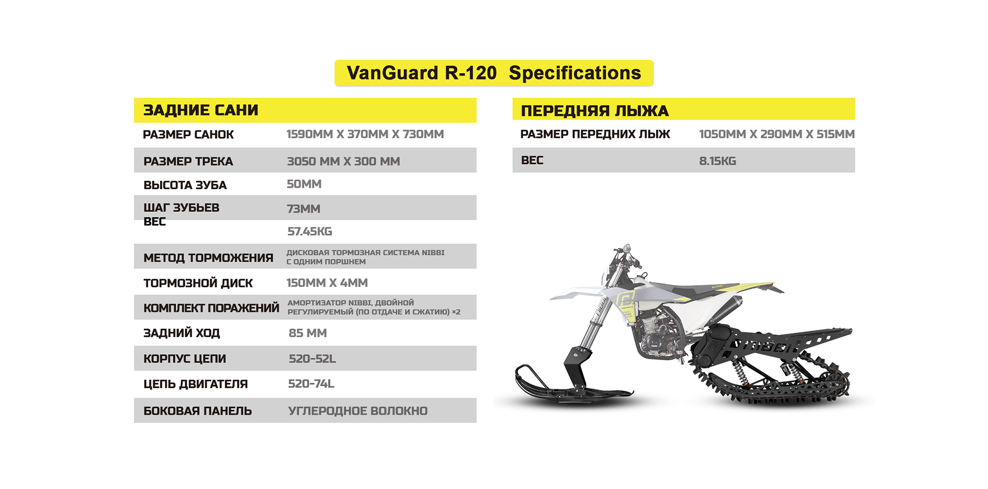 Vanguard — это система переоборудования сноубайка, позволяющая превратить ваш кроссовый мотоцикл в сноубайк. Лыжи заменяют переднее колесо, а гусеница — заднее. После этого сноубайк можно снова превратить в кроссовый.