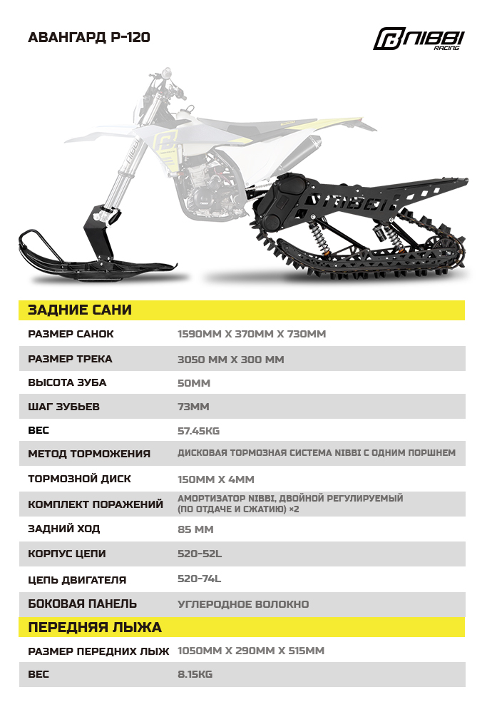Гусеница R-120 размером 3050 × 300 мм с грунтозацепами высотой 50 мм, разработанная для максимального сцепления и долговечности, обеспечивает плавное и отзывчивое движение в любых условиях снега и бездорожья. Она способна преодолевать снег глубиной более 15 см и даже глубокий рыхлый снег глубиной до 1,5–2 метров, обеспечивая непревзойденную проходимость на экстремальных зимних трассах.